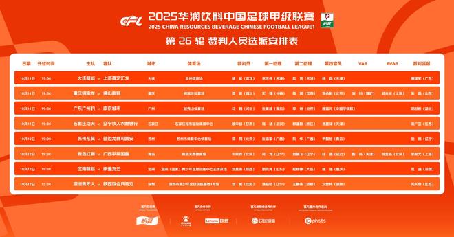 2025赛季中甲第26轮比赛将于10月11日至12日开赛,赛前,中国足协公布了本场比赛的裁判选拔时间表。与前几轮一样,本轮将对涉及中超和保级的两场关键比赛进行视频裁判(VAR)。重庆铜梁龙队对阵南佛山狮队,青岛红狮队对阵广西平果国晶。其中,顶级联赛重庆铜梁龙之队与降级球队佛山南狮队的主场比赛,裁判将由来自中超湖北省的何凯担任。第一助教是来自长春的史强,第二助教是来自江苏的陆爽。第四官员是来自北京的李惠刚。视频助理裁判是来自煤矿的刘钊,视频助理裁判是来自上海的邱兆军。裁判长是来自山东的武磊。查教练率领的重庆铜梁龙之队ng外龙鑫在最后一轮表现挣扎,但最终重回胜利轨道。本轮他们回到了主场。他们唯一的目标就是再拿三分,继续巩固领先优势。距离降级区仅4分的佛山南狮不能放松警惕。在本赛季的第一场比赛中,我们1-1战平,但我们希望确保在下一场比赛中获得更多积分。青岛红狮队与广西平果国靖队的比赛将由北京出生的中超裁判牛明辉担任主裁。第一助教和第二助教分别是来自辽宁省的贺龙和刘登飞。第四任官员是延边人任通。视频助理裁判为来自天津的甄伟,视频助理裁判为来自北京的陈敬东。主裁判由上海选手邹家友监制。这是一场保级之战,目前还剩六分。若气目前联赛垫底的青岛红狮队未能拿到三分,而对手深青队获胜,青岛红狮队将比计划提前四场降级。另一方面,如果青岛红狮成功的话,他们至少能够遏制住同样处于降级区的广西平果,并有机会追上对手。广西平果目前距离安全区仅差两分。他们想要保级,希望加三分。 2019年上半年,广西平果队主场对阵青岛红狮队打入三球,导致时任青岛红狮队主教练马永康辞职。此役的另一亮点是现任青岛红狮队主帅、此前执教过广西平果队的王潇。阿霍拉带领他的团队反抗他的前任老板。看看他未来是否能证明自己的能力将会很有趣。其他比赛中,领头羊辽宁铁人农商银行客场对阵石家庄功夫。裁判是来自甘肃的顾忠超。第一位与会者是来自武汉的陈岩先生,第二位与会者是来自浙江的郝鹏波先生。第四官员是来自天津的易家进。裁判主任是来自江苏省的周光亚先生。作为中超晋级热门,辽宁铁人已经在中超领先8分。下一场客场比赛非常重要。如果他们能延续连胜,基本就能提前锁定中超席位。理论上,石家庄功夫还是有希望冲击第一的。所有的目光都将集中在他能否阻止他的领先地位。中超另一支夺冠热门广东省吴州豹队本赛季将在主场迎战南京城队。来自河北省的裁判马腾将担任裁判。第一助理是张M青岛的艾琳,第二助理是北京的李帅。第四位裁判是中国体育总会赖穆富鹏。裁判长是来自湖北的郑树桥。广东广州豹目前距离晋级中超仅差两分,这意味着他们只需要一场比赛就能改变命运。为此,我们必须全力以赴,不断取得胜利。中超沉阳主裁刘伟将执法深圳青年主场对阵陕西联合月亮公园的比赛。第一助理为辽宁省屠云涛先生,第二助理为成都王鹏伟先生。第四位官员是来自湖南省的温思维。主裁判是来自江苏的路易斯天池。此役与深青的降级趋势有关。他们距离降级区仅差两分,必须努力通过一场胜利巩固在降级区的领先优势。这大连坤辰与上海嘉定汇龙的比赛也涉及到客队的保级走势。来自武汉的裁判员熊兴将担任裁判。第一助理、第二助理、第四裁判均来自天津:赖精卫、赵亮、韩磊。裁判长是来自广东的连建军。上海嘉定汇龙还没有完全摆脱降级的危险。至少本赛季客场比赛,我们的目标是保持不败。理论上,延边龙丁卡西安也有希望冲击第一。这一天他们将客场对阵苏州苏州。来自北京的郭翔裁判将担任裁判。第一助理和第二助理都是来自广西壮族的张海和阮华。第四官员是来自青岛的尹志凯。裁判长是刘琳,辽宁人。延边龙鼎的主场战绩非常出色,但客场战绩却表现平平。如果你不这样做本轮拿到3分,就基本退出第一名的争夺。定南甘联和南通支云是两支得分相同的球队。裁判由来自陕西省的刘晨涛担任。第一助教是来自山东的顾以安,第二助教是来自大连的程向正。第四官员是来自重庆的陈浩。裁判长是来自深圳的范强先生。两支球队的欲望都相对较小,最终都是为了荣誉而战。